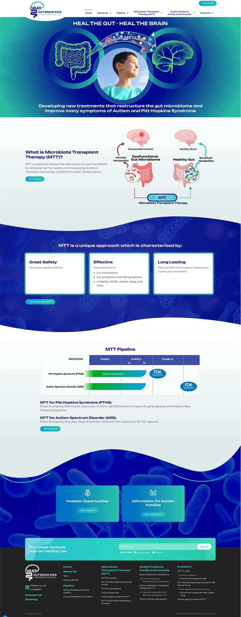 Gut-Brain-Axis Therapeutics, Inc. (GBAT) came to Axxiem for updating their existing logo, brand, and website. Axxiem worked closely with GBAT to understand their business needs and design their new website in a way that clearly represents the company’s goals and the many beneficial aspects of their therapy. In addition to their website redesign, Axxiem updated their logo and brand colors, added functionality, and created a custom pipeline, PowerPoint deck, and multiple custom and simple graphics. GBAT is very pleased with their attractive and intuitive website and the added features it offers visitors.